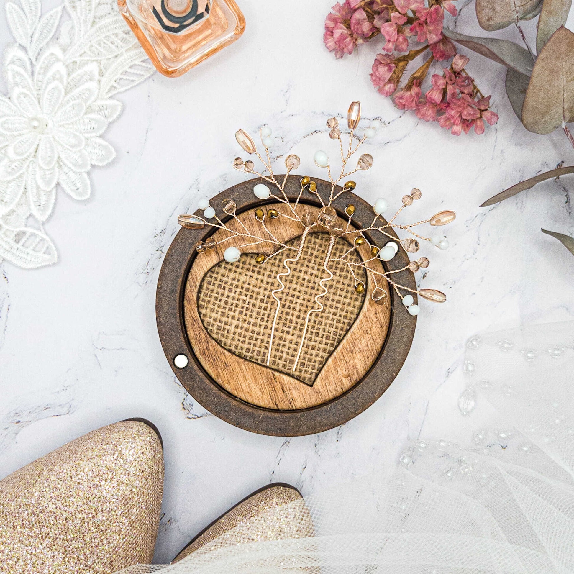 El Tocado Alelí presenta un deslumbrante tono dorado claro que añade un toque de sofisticación, luminosidad y encanto delicado a tu peinado nupcial, ya sea que optés por un peinado recogido o semi-recogido.