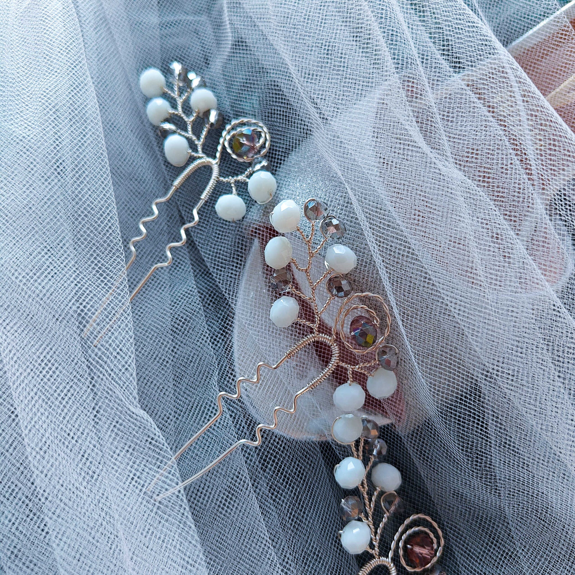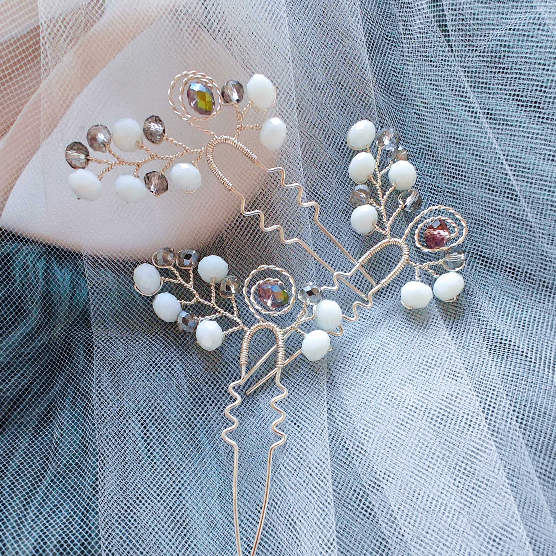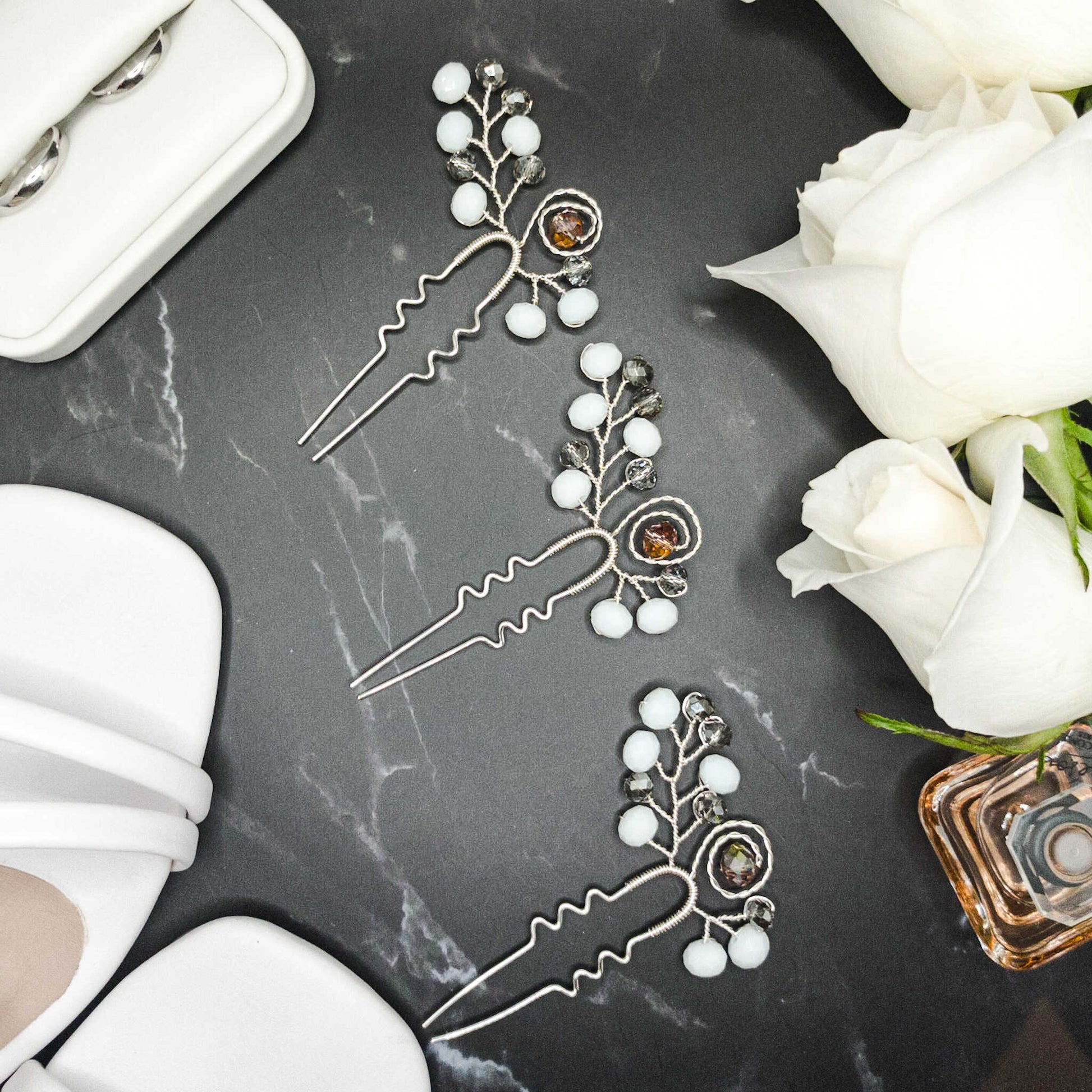 Este tocado de incluye un trío de hadpins con aretes a juego, brindándote una combinación perfecta y completa para un estilo nupcial impecable. Está confeccionado en un deslumbrante color plateado, adornado con cristales en tonos blancos, gris ahumado y un cristal central con un magnífico efecto tornasol. Es la elección ideal para realzar tu peinado recogido o semi-recogido, añadiendo un brillo radiante y destacando tu belleza natural.