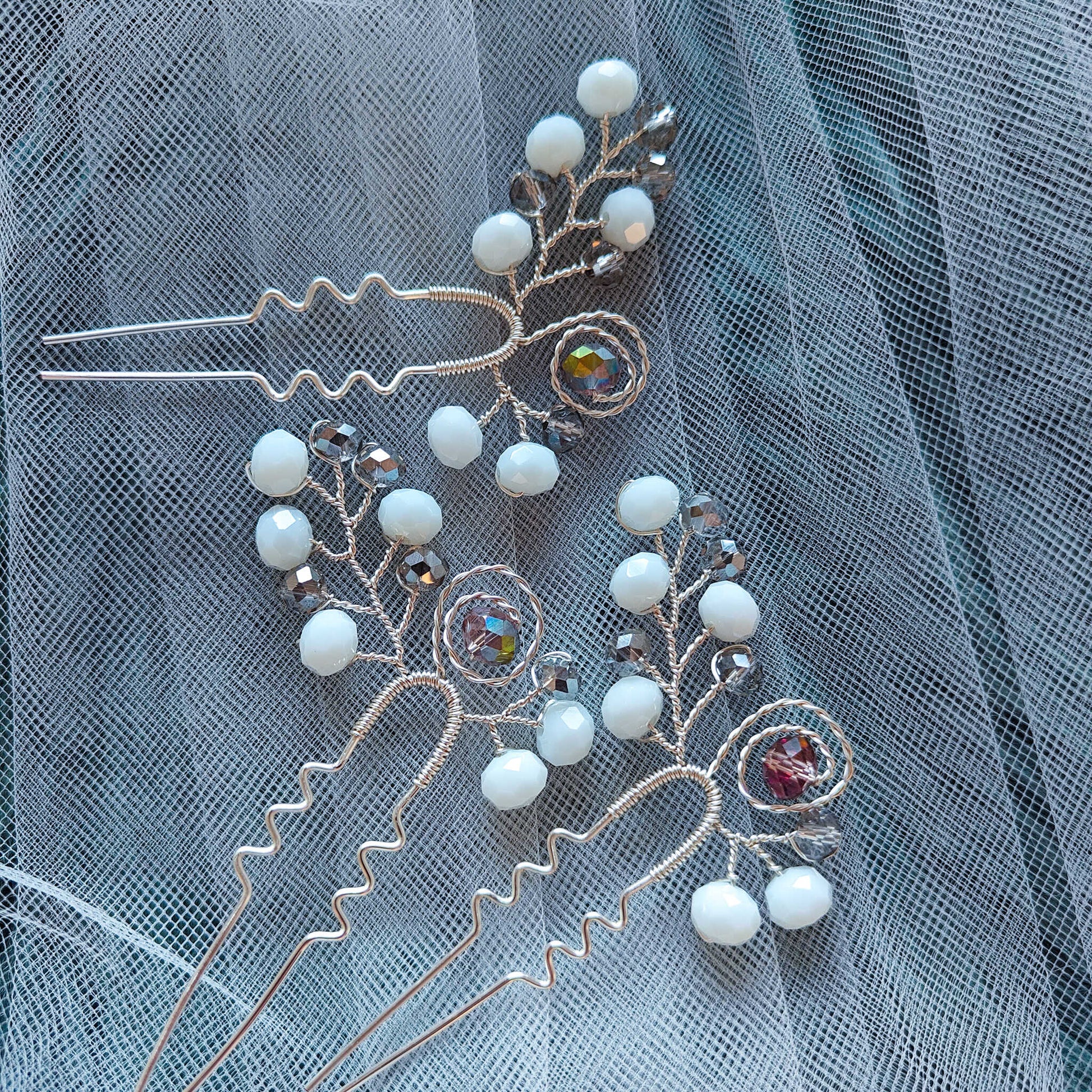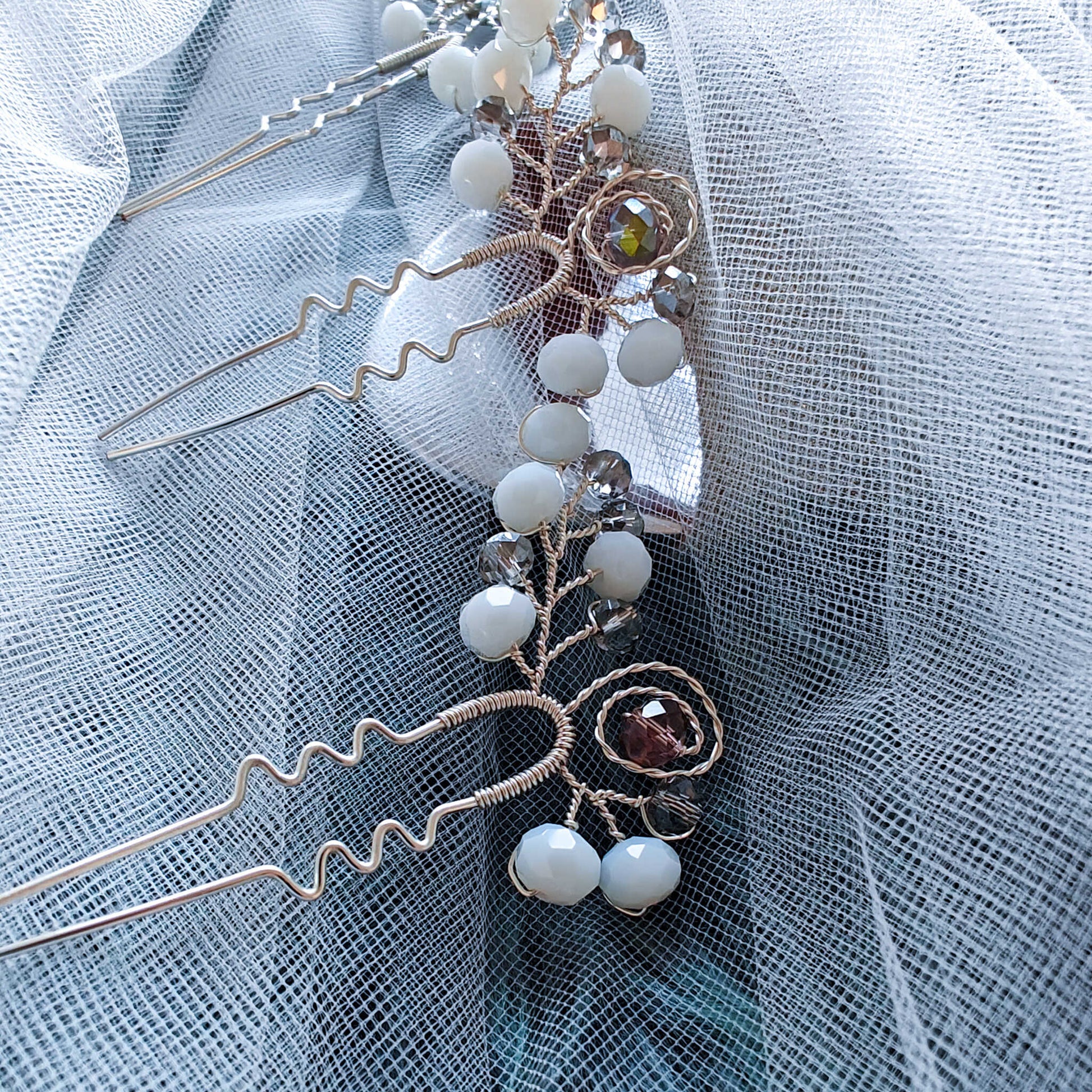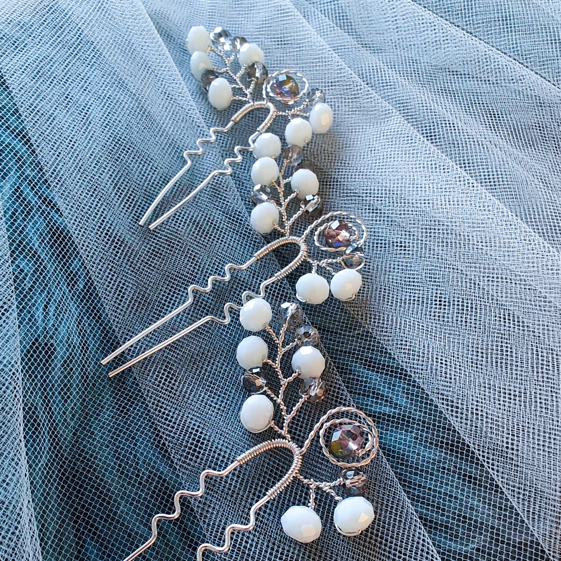 Este tocado de incluye un trío de hadpins con aretes a juego, brindándote una combinación perfecta y completa para un estilo nupcial impecable. Está confeccionado en un deslumbrante color plateado, adornado con cristales en tonos blancos, gris ahumado y un cristal central con un magnífico efecto tornasol. Es la elección ideal para realzar tu peinado recogido o semi-recogido, añadiendo un brillo radiante y destacando tu belleza natural.