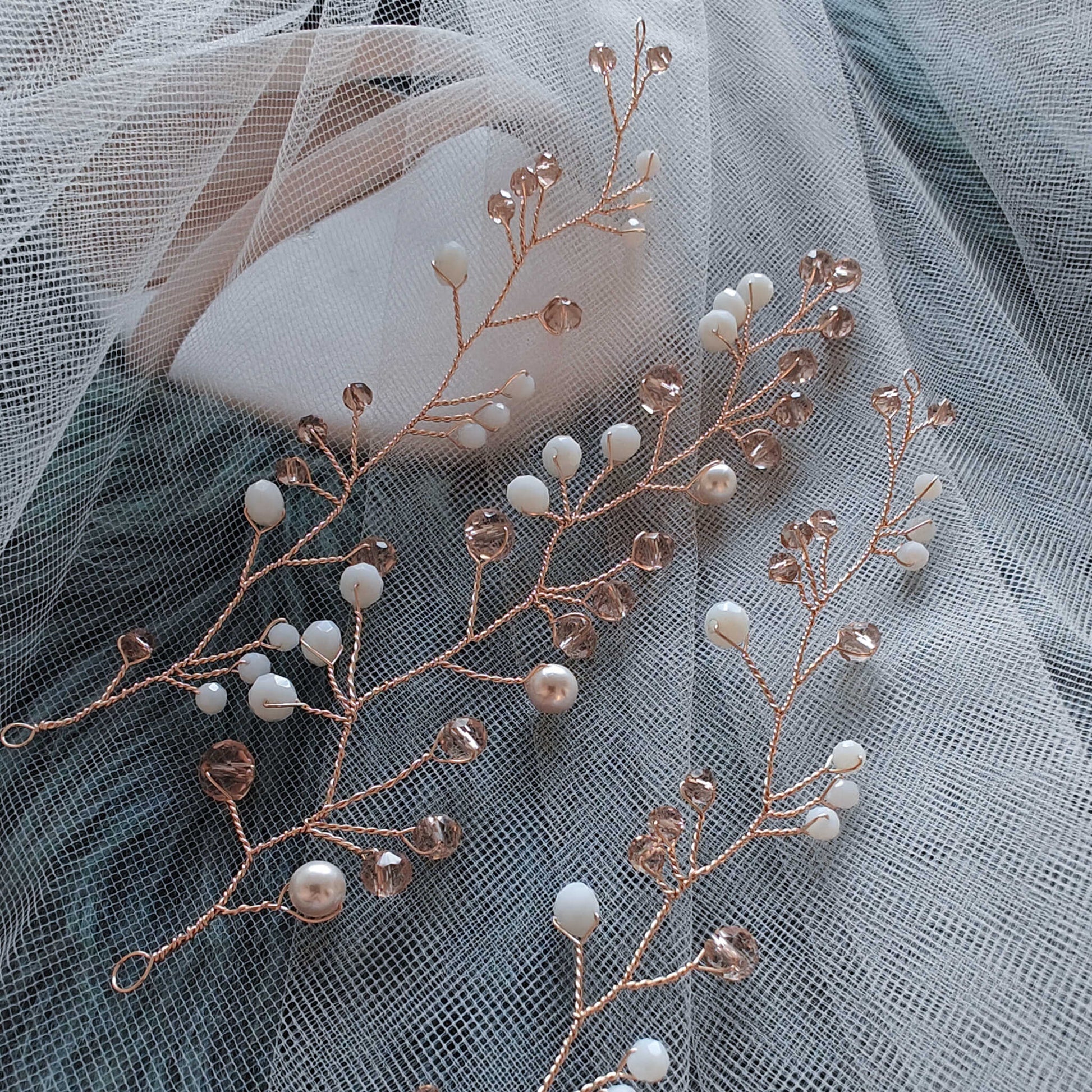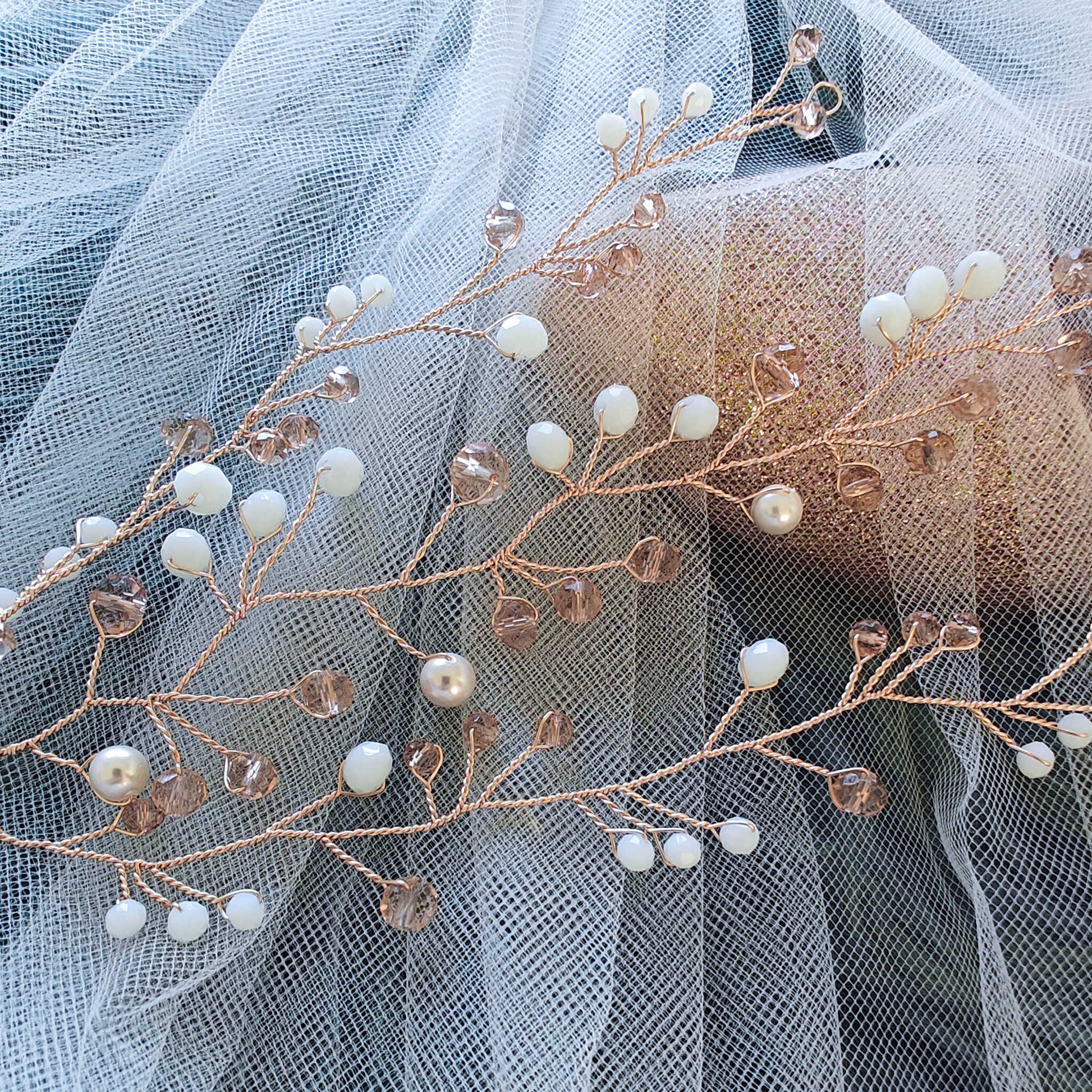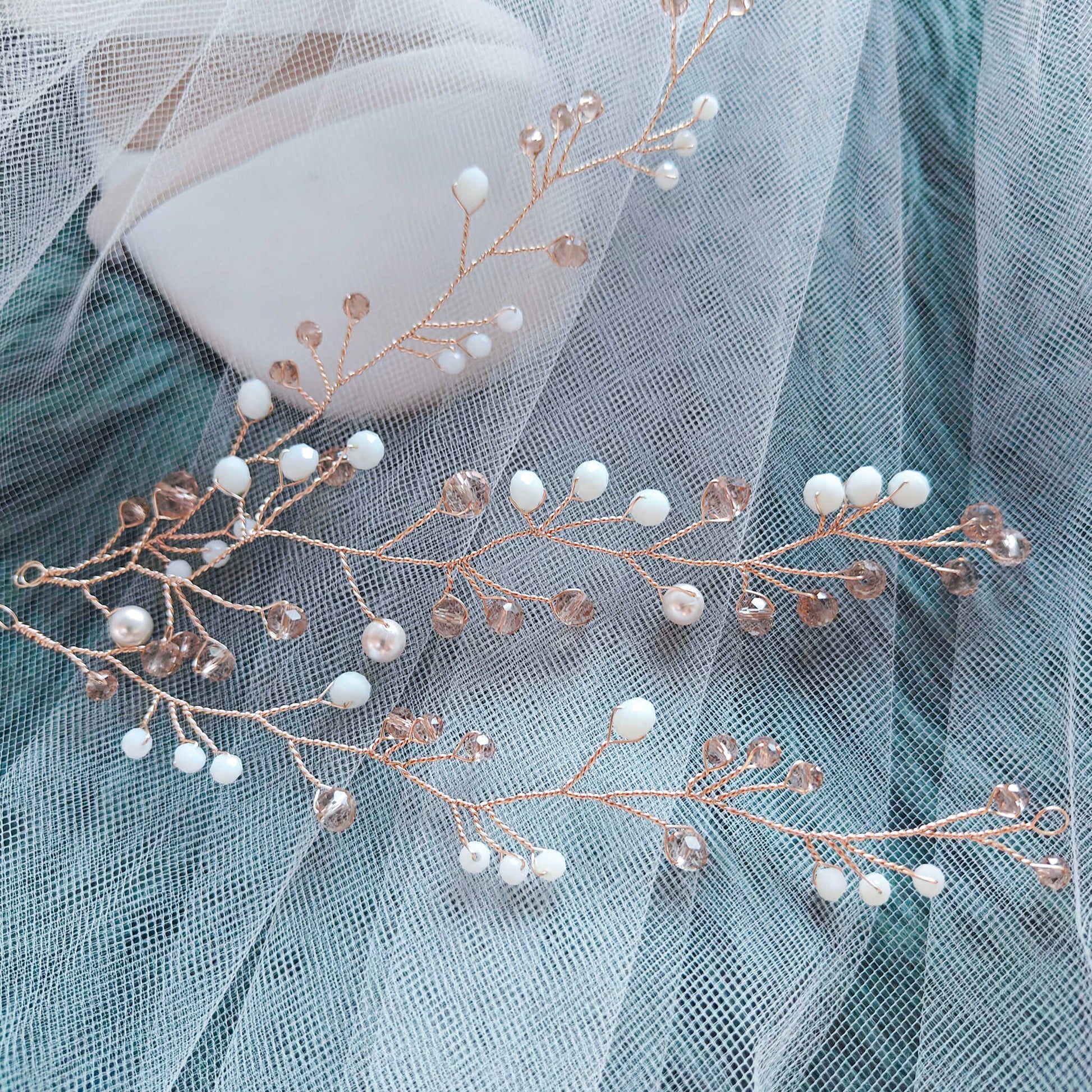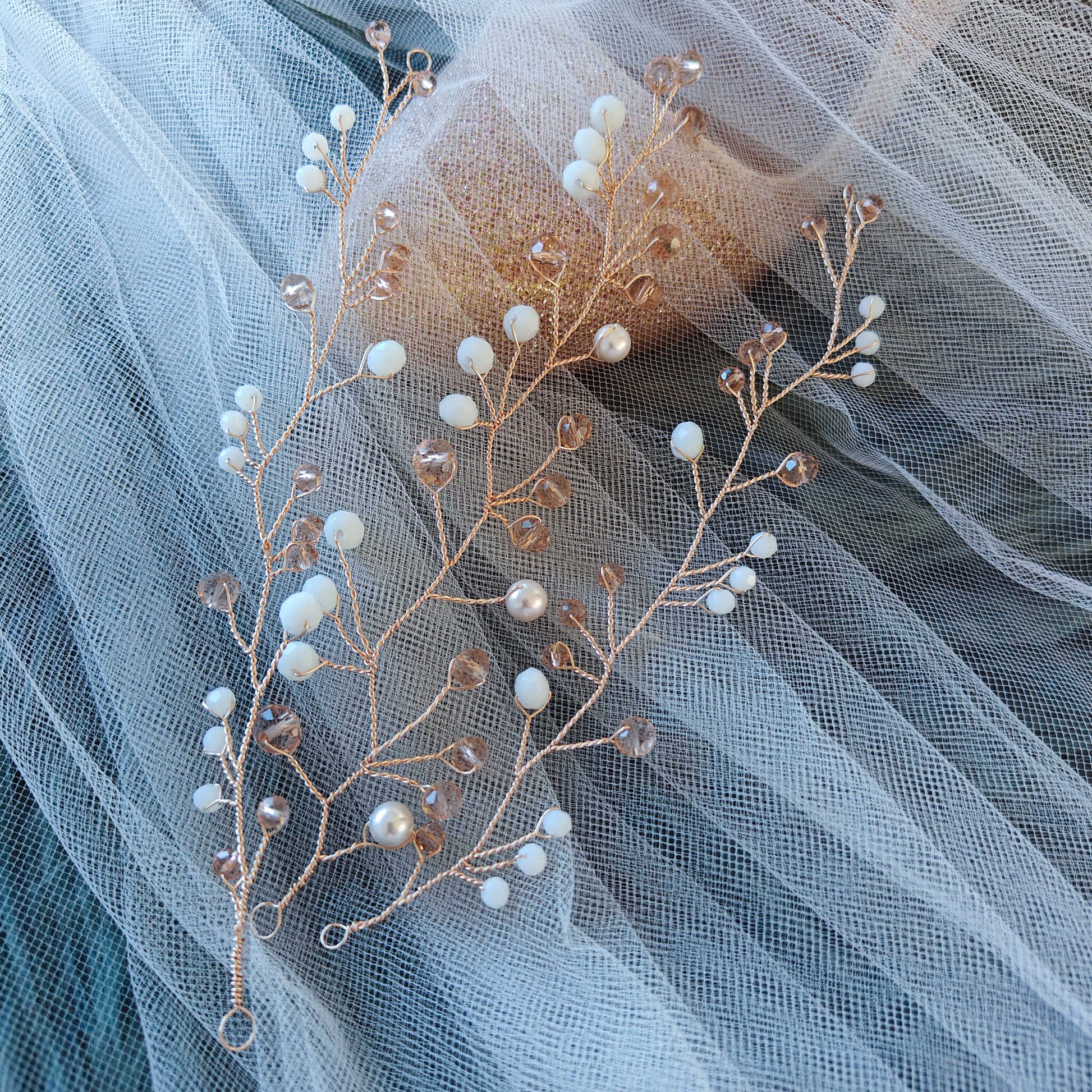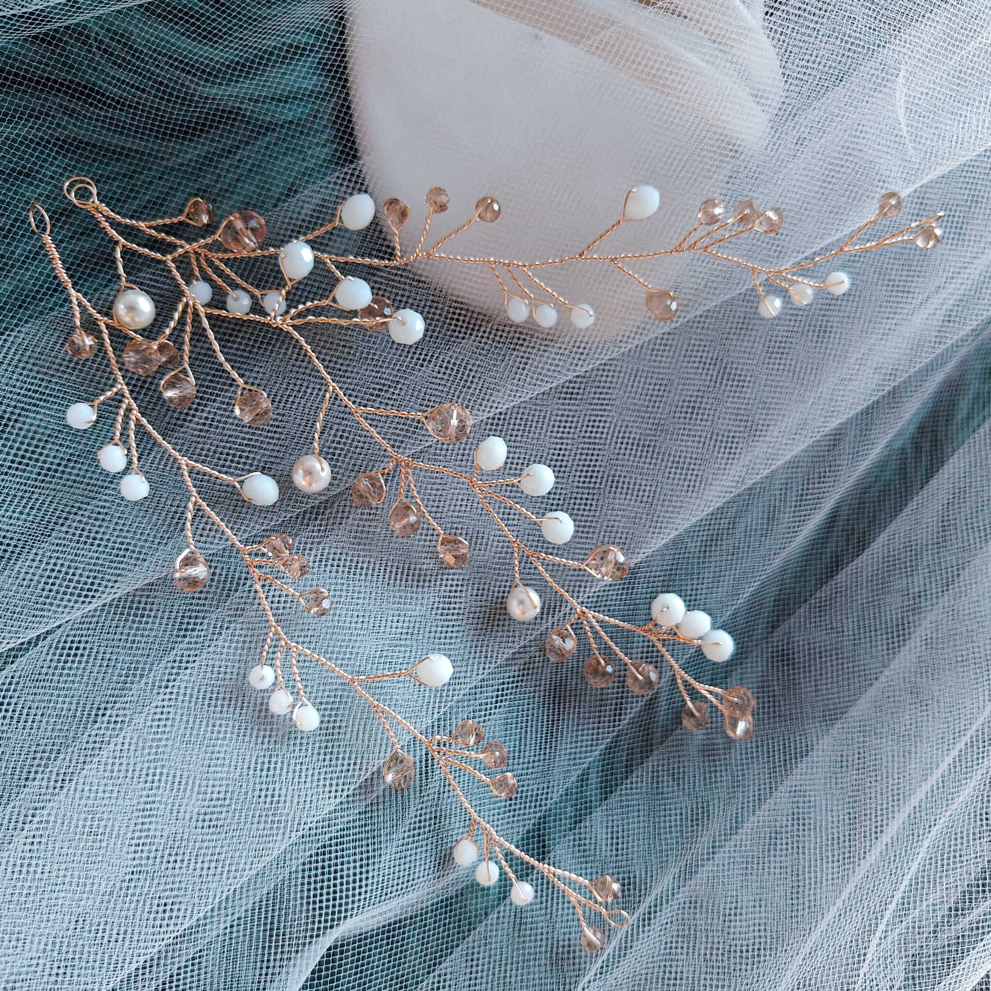 Completá tu look nupcial con nuestro Tocado Pili Trío. Este tocado presenta tres pequeñas y flexibles guías doradas adornadas con cristales blancos y ámbar. La guía central también está decorada con perlas de nácar blancas.